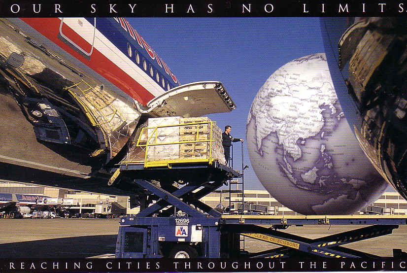 In between, the major carriers had moved in and out of dedicated freighting. British Airways briefly had dedicated 707 and 747 freighters but now only uses under-floor containers or sub contractors. Lufthansa has stayed with a dedicated freight fleet , now based around the MD-11, a type that will soon only be seen in freight configurations. The card below is typical of the publicity cards with pre-print backs, often large, size put out by the major carriers, in this case American. I think it's a passenger MD-11.