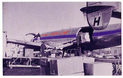 Post WW2 freight operations can be split into 2 phases. The first involved "sky tramping" operations using cheap war surplus DC-3s, DC-4s and especially in the Americas C-46s. One such was Flying Tiger, formed by the chief of the Chinese based USAAF squadron of that name. By the 50s they had progressed to Super Constellations as on this airline issue card.