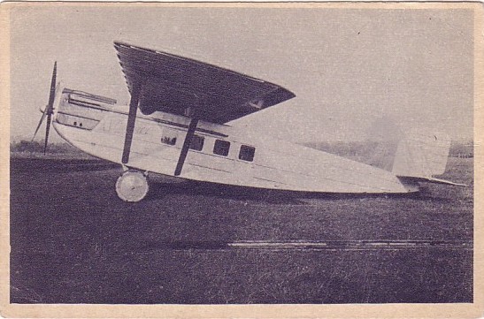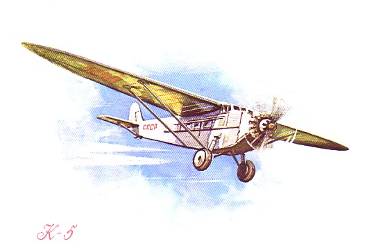 The first Soviet airline, named Dobrolet was formed in March 1923, following the approval in February of plans for the development of civil aviation under the supervision of the air force. Those plans also included the set up of carriers in the other Soviet republics. That for the Ukraine was to be based in Kharkov. It would have the support of local banks and commercial enterprises and would have an initial fleet of 2 German Dornier Komet II 6 passenger monoplanes. Scheduled services were launched on 25 may 1924 Kharkov-Poltava-Kiev and Kharkov-Poltava-Yelisavetgrad-Odessa. By suspension of operations at the end of September 760 passengers, 649 kilo of freight and 137 kg of mail had been carried. The service was reactivated in 1924 and routes to Rostov and Moscow from Kharkov were added. Russian aircraft were added in the form of the Tupolev 9 passenger ANT-9 in both 2 and 3 engined forms, Polikarpov R5 single engined biplanes , Stal-2 monoplanes and Shavrov Sh-2 amphibians. The Kalinin K5 , a true Ukrainian 8 passenger monoplane design was used in 1919. Here is one on an Aeroflot history card.