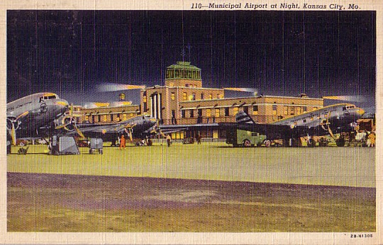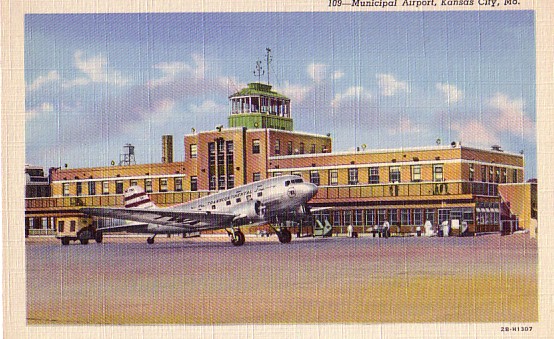 The originals of two are shown , the third is of the terminal building with two TWA DC-3s plus other aircraft. The colours on the reproduction cards are not perfect, the TWA markings come out black and the cards are overall yellower. But the original colours were not perfect either. These are No s 109 and 110, linen cards for Max Bernstein of Kansas City by Curteich of Chicago. The 1950 date on the repro is too late, one of the originals was mailed in 1943.