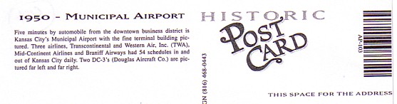 As the museum is based at Downtown Kansas City airport, there is also a strong interest in the history of the airport, formerly the main airport for Kansas City. The AHM sells reproductions of three historic Kansas City airport postcard published under the local "Historic Postcards" name. They can be distinguished from the originals only by the back ( So Internet buyers beware - DB) which is as shown