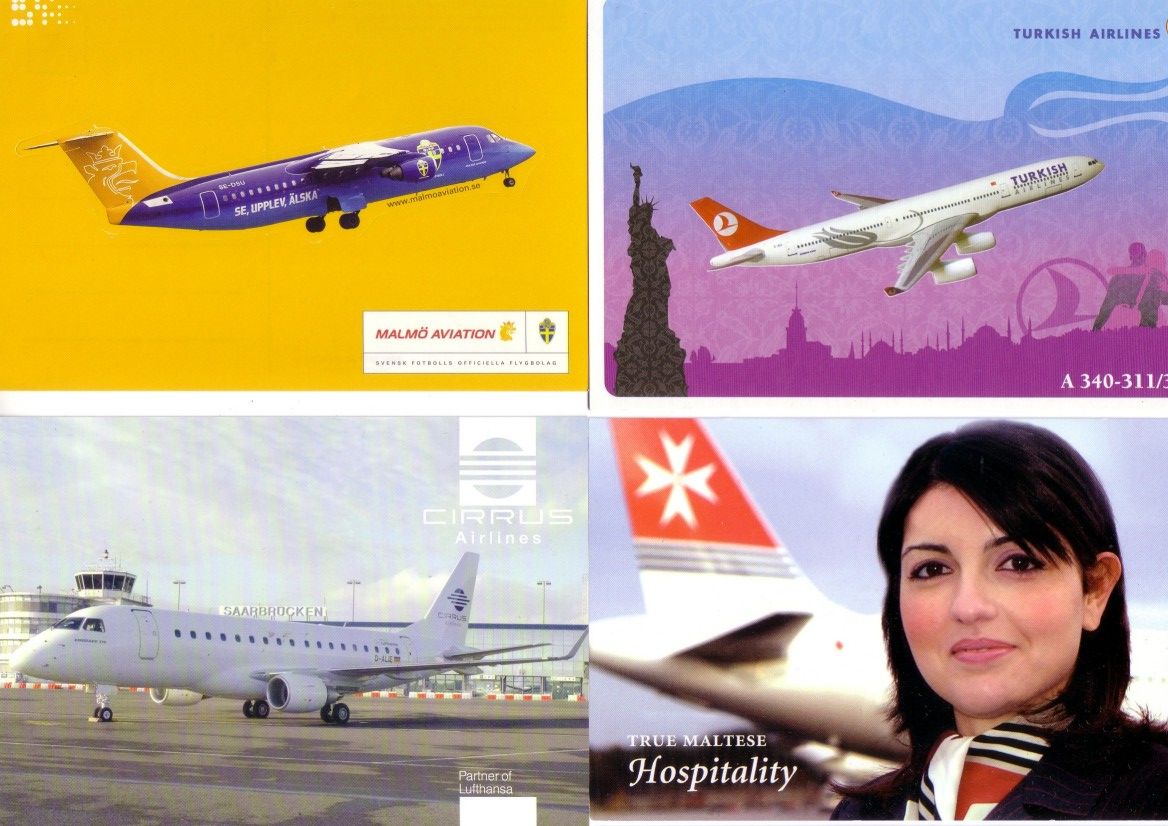 None truer of this trend are the two latest cards by AirMalta who previously issued large size cards that showed off their aircraft, the current issue merely has the tail logo. There are some exceptions though. Cirrus Airways of Germany have produced a nice set of four cards of their fleet. TNT have a nice card of a BAe146QT with various larger freighter tails behind. Lufthansa seem to be the only airline that continues to issue loads of cards of their aircraft. I have two albums full of them and still do not have room for them all. TAP have a new livery set of various Airbus types that may still be found on board.Air Baltic have issued two new 737-500 cards and Malmo Aviation have issued two BAe146 cards – a ground rear view and one that doubles as a sticker.