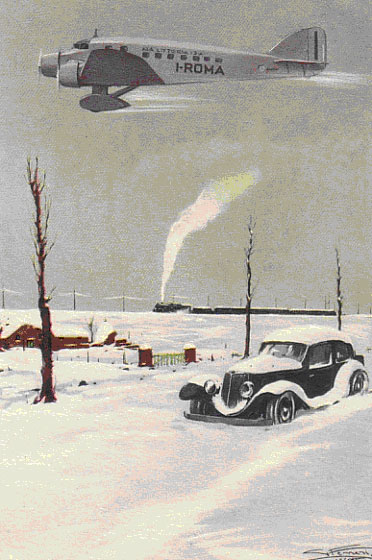 The feature card is a piece of classic nostalgia, firstly for when December had some connection with snow, even in Italy and again for the age when all forms of transport were seen as the height of progress. This Ala Littoria card from 1935 by artist Boeri celebrated the modernity of Mussolini s Italy with a Savoia S.71. There is no other connection with the contents of this issue other than that, with the ending of Colin Cohen’s series the title of “Most Frequent Contributor” passes to Leonardo Pinzauti. Leonardo will not take a regular slot but this month features the popular card topic of the Channel car air ferries. Colin’s old back page slot in the print version will now be used for Worth a Second Glance which has wandered about a bit lately to fit in with larger articles. This will be academic for on-line only members who had their big format change last time. In the absence of any comments I assume the new format is certainly acceptable or even an improvement.