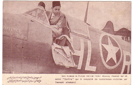 Although the bulk of WW2 postcards are the mass produced recognition and/or propaganda cards, occasionally one surfaces which features a lesser known aspect of operations. One such is this card, produced in French North Africa and titled in French & Arabic "His Highness the Crown prince Emir Moulay Hassan in a Spitfire aeroplane which has achieved many victories over the German enemy".