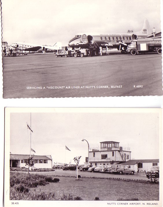 Civil flying pre-WW2 had also used the RAF Station at Aldergrove, but between then and the re-establishment of Aldergrove as “Belfast International”, in 1959 the airport for Belfast was Nutts Corner, itself quite near Aldergrove. Sydenham = Harbour=George Best was also briefly used in 1945/6. Publishers Valentine & C Richter both produced sets of RP postcards of Nutts Corner. Shown next are Valentine R4892 with Viscount G-ANHA from the 2nd batch of BEA’s 700 series fleet and Richter 20.435 showing the very basic terminal and tower with a BEA Viking background and the pride of the British motor industry foreground. The notice on the tower is “Airport Garage. Facilities for Passengers Cars”.