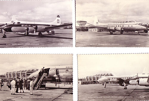 The others known are .... Richter 20.431 Terminal from airside with BEA DC-3 & Viking at left 20.432 Same but close up Viking behind DC-3 20.434 DC-3 G-AGIP close –up . Someone must have 20.433 ! Another Valentine is R4893, showing the viewing area with 2 BEA DC-3s. Nutts Corner was subsequently used for various forms of motor sport. Like Belfast, Glasgow has two airports, if you count Ryanair operations from Prestwick. Before Abbotsinch was opened for civil operations in 1966, the main airport was Renfrew. Unlike Nutts Corner, this had been developed with new buildings in the 1950s, so attracted a variety of RP publishers, with Valentine and the ML National Series prominent. Featured Renfrew cards are probably from the same photo shoot but with 2 gaps in the number series. Also a on-BEA Heron appears on 2 multi views among landsides, and an Aer Lingus DC-3 on 7 view D625. There is also a later D8162 with a BEA Vanguard.