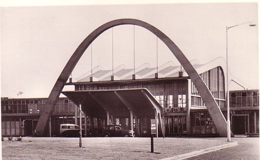 The main feature of the 1954 buildings was the terminal in a style reminiscent of the 1951 Festival of Britain. The entrance is shown on this ML card. Another ML card has BEA DC-3 G-AJHZ landside of the new terminal.