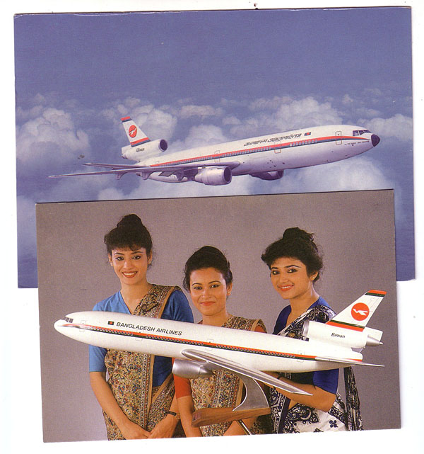 The two-part state of Pakistan collapsed, with some assistance from India in 1971. The new state of Bangladesh remains one of the most densely populated countries on Earth with high levels of poverty and vulnerability to sea level rises. Despite this it has operated an international service airline Biman Bangladesh since 1972 when it was set up by Ex PIA staff. International operations have used 707s, DC-10s, A310’s and currently 777. In the DC-10 era two cards were issued – the air view is oversize
