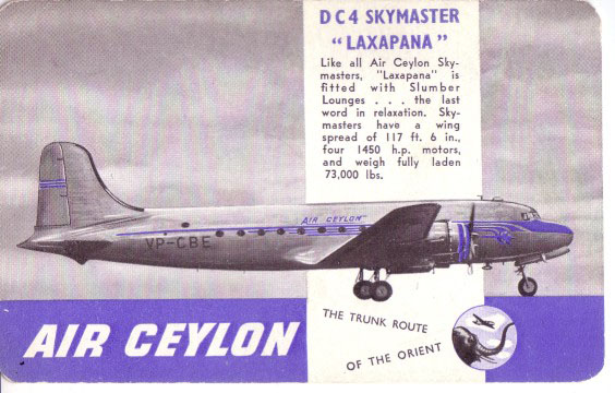 Ceylon had no pre war airline but after independence in 1948, Air Ceylon operated with aid from various airlines. The first was Australian national from whom DC-4s were leased for service to Europe.