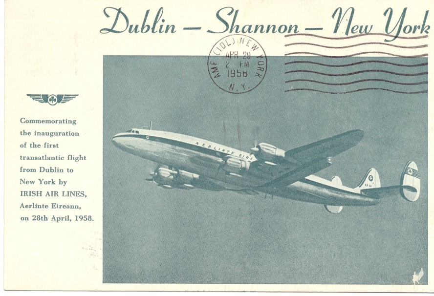 The idea of serving the US Irish community was too attractive not to be tried again and in 1952 an agreement was signed with Seaboard Western to lease Super Constellations to revive the service. The first westbound flight was on 28 April 1958, following a pre-inaugural eastbound flight which ended up 20 hours late after engine problems at Gander. This card was produced for the inaugural flight and has been submitted by both Bill Baird and Alan Van Wickler. The pre-postmarking appears to be common to all copies.
