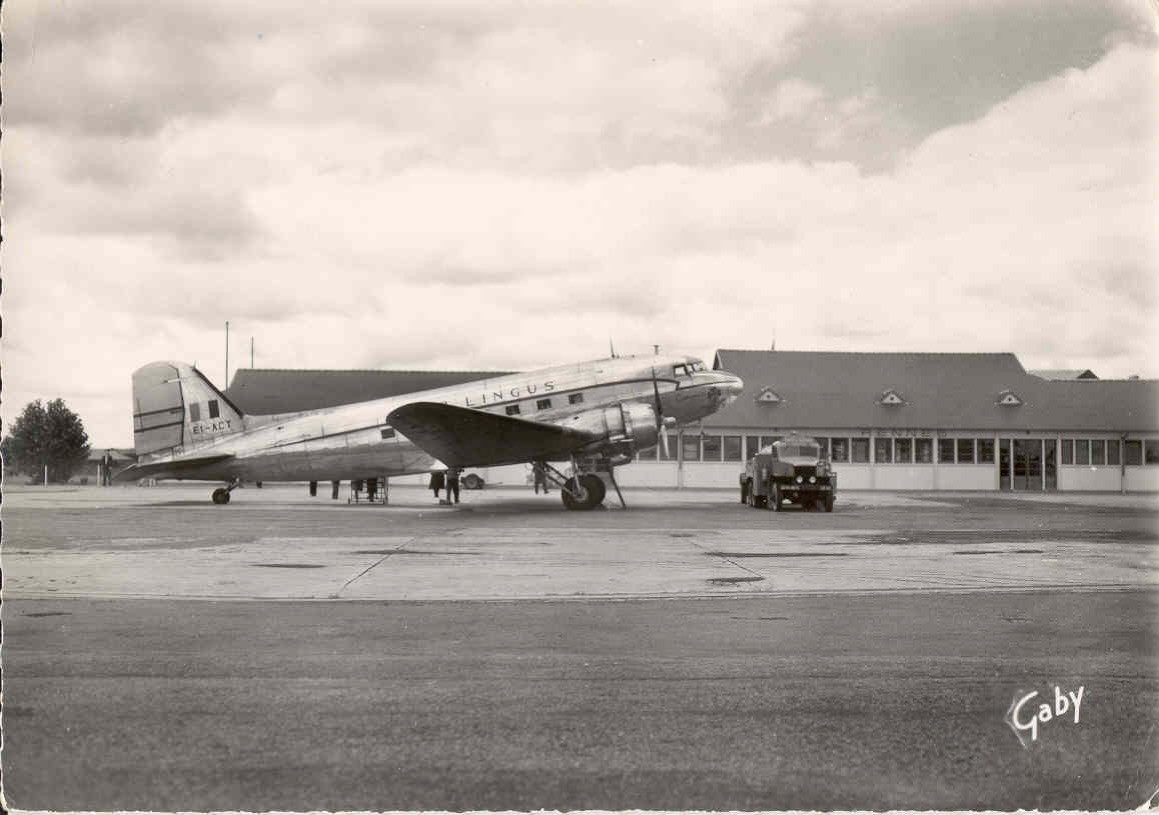 Aer Lingus at Rennes. Close up and aerial views of bare-metal DC-3. The close up is EI-ACT St Colman.