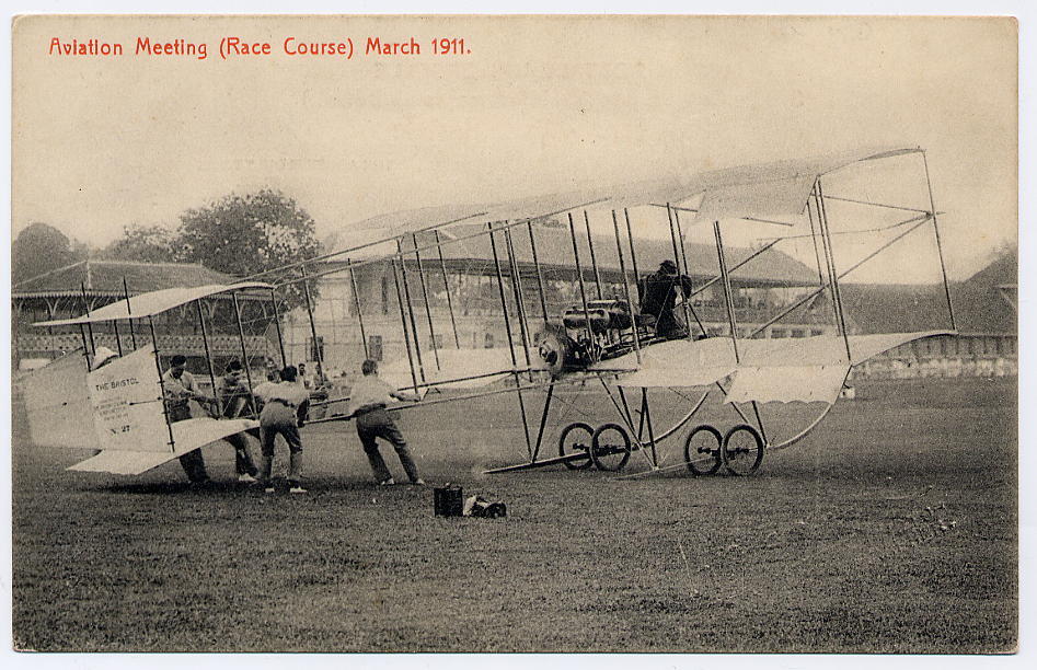 It is sometimes quite surprising how fast first flights in the then Empire followed progress at home. A card recently auctioned on the Internet followed the general rule that the collecting process is a means whereby postal items eventually return to their point of departure. It shows, apparently, the first ever aviation meeting in Singapore which took place in March 1911 and this card, pub. Max Hilckes in Singapore, shows the Belgian aviator Joseph Christiaens (1882-1936) in his Bristol Boxkite about to take off.