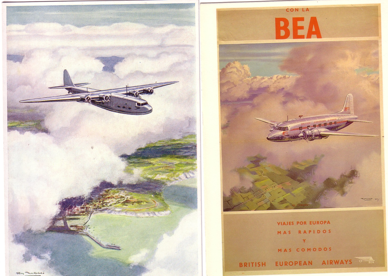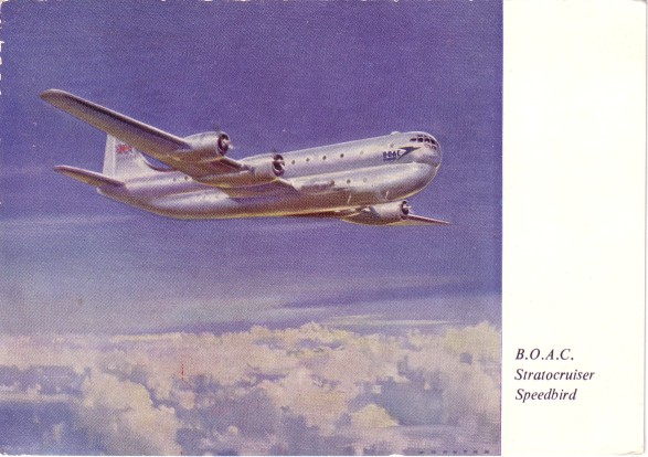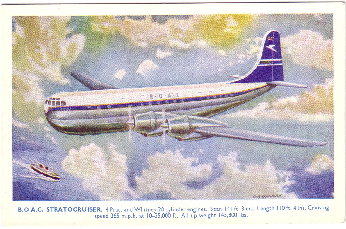 Frank Wooton was a prolific illustrator of the British aviation scene in the 1950s and produced paintings used promotionally by several British companies, notably deHavilland. His first aviation paintings date from his time as a WW2 official RAF war artist. His BOAC paintings were used on cards by both the company and Salmon – the signature can be seen on the BOAC version of the Constellation and Stratocruiser as here in the first bare-metal scheme. He was still active in 2002.