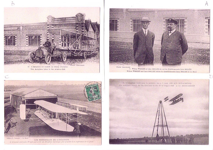 4 cards of Wilbur in France. The Flyer en route from factory to flying field : Flyer outside its hangar, also where Wilbur slept – the stamp is dated 25 Aug 08 : Wilbur & Louis Bollee : The only known first flight card – with catapult derrick which dropped a 700 kg weight to effect the launch.