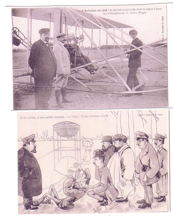 ![]() Top : Final preparations for flight. This shows up the Flyer’s skid undercarriage. Wilbur on the right , Leon Bollee left and Wrights French agent Hart O Berg centre. Bottom : Cartoon entitled “ Aviation has its little problems. Bollee left, Wilbur inspecting the wing, watched by Bleriot ( in Bowler) and others. The cartoonist is clearly the same as the one who portrayed Wilbur on the card which fronted the December 2003 Special Wright edition of the Newsletter