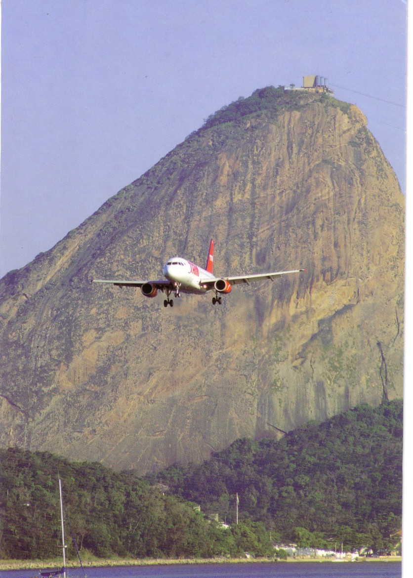 To set the scene is an unusual “scenic” view from “Postcard” one of the current crop of Czech publishers and shows an Airbus A320 of Brazil airline TAM on approach to Santos Dumont Airport, Rio.