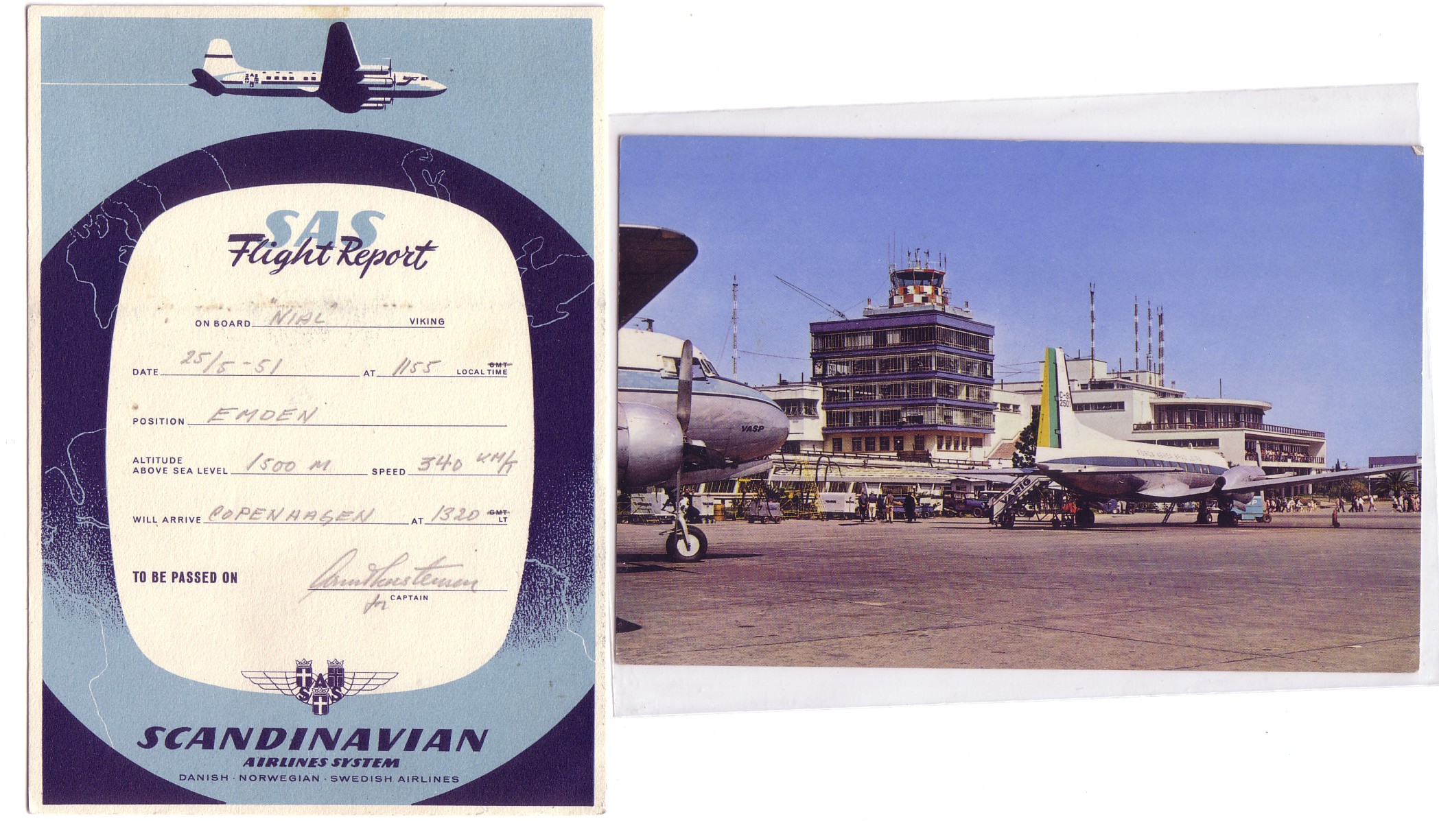 Well, although the SAS card shows a DC-6, the passenger who filled it in says he/she was flying over Emden, Germany inbound to Copenhagen at 1155 25 May 1951 at 1500m at 340 km/h in “Nial Viking”. But Nial Viking, LN-KLK, was not a DC-6, it was a SAAB Scandia – which is what the nose left on the view of the Brazil Air Force HS748 at Sao Paulo Congonhas Airport belongs to. Congonhas was Sao Paulo’s equivalalent of Santos Dumont at Rio, being very close to the centre.