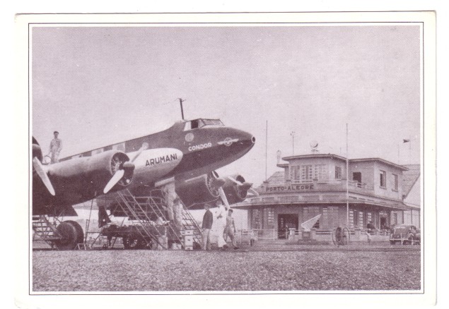![]() During WW2 the German owned Condor Syndicate was taken over by the Brazilian State and renamed Cruzeiro Do Sul ( Southern Cross). In the 1990s Cruzeiro was absorbed by VARIG which had started life as a partner of Condor in the 1920’s, not expanding in its own right until 1939. VARIG issued this next history card of a Focke Wulf Condor operated by Condor at the airport of Porto Alegre where VARIG was founded.
