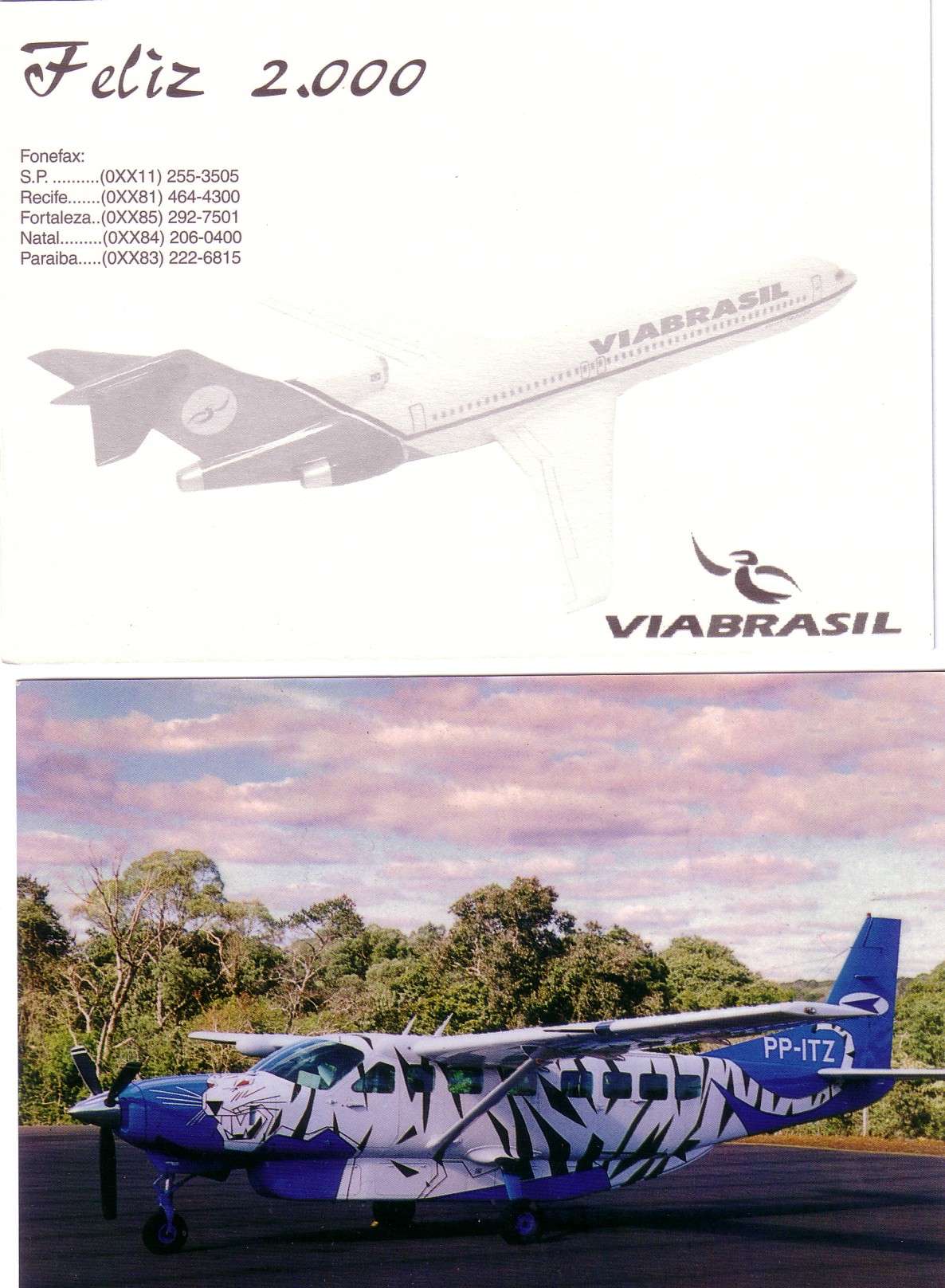 ![]() The Rio Sul card features the Embraer ERJ-145. Unfortunately the decline of the airline issue postcard coincided with the rise of this Brazilian regional jet in the fleets of the worlds airlines so it is relatively under represented. Also under-represented are the latest generation of Brazilian airlines. One short-lived carrier ViaBrasil produced a 2000 new year card with views + a small model 727 on the face but this larger image on the writing side. New low-cost, one-word-name carriers such as Gol ( = Goal, of course) have not produced cards themselves but see later. The card below of local carrier Aero Express of a Cessna Caravan does however appear to be airline issue