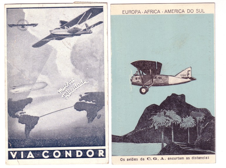 Positioned on the narrowest point of the South Atlantic Brazil was both a gateway to South America from Europe and a valuable destination in its own right. In the 1930s the former colonial powers Spain and Portugal was economically depressed and did not develop significant commercial aviation. The initiative to develop service from Europe was therefore contested between France (Aeropostale, Air France) and Germany (Lufthansa, Deutsche Zeppelin Reederei and their Brazilian offshoot Syndicato Condor) All published postcards, particularly for the Christmas/new year mail.