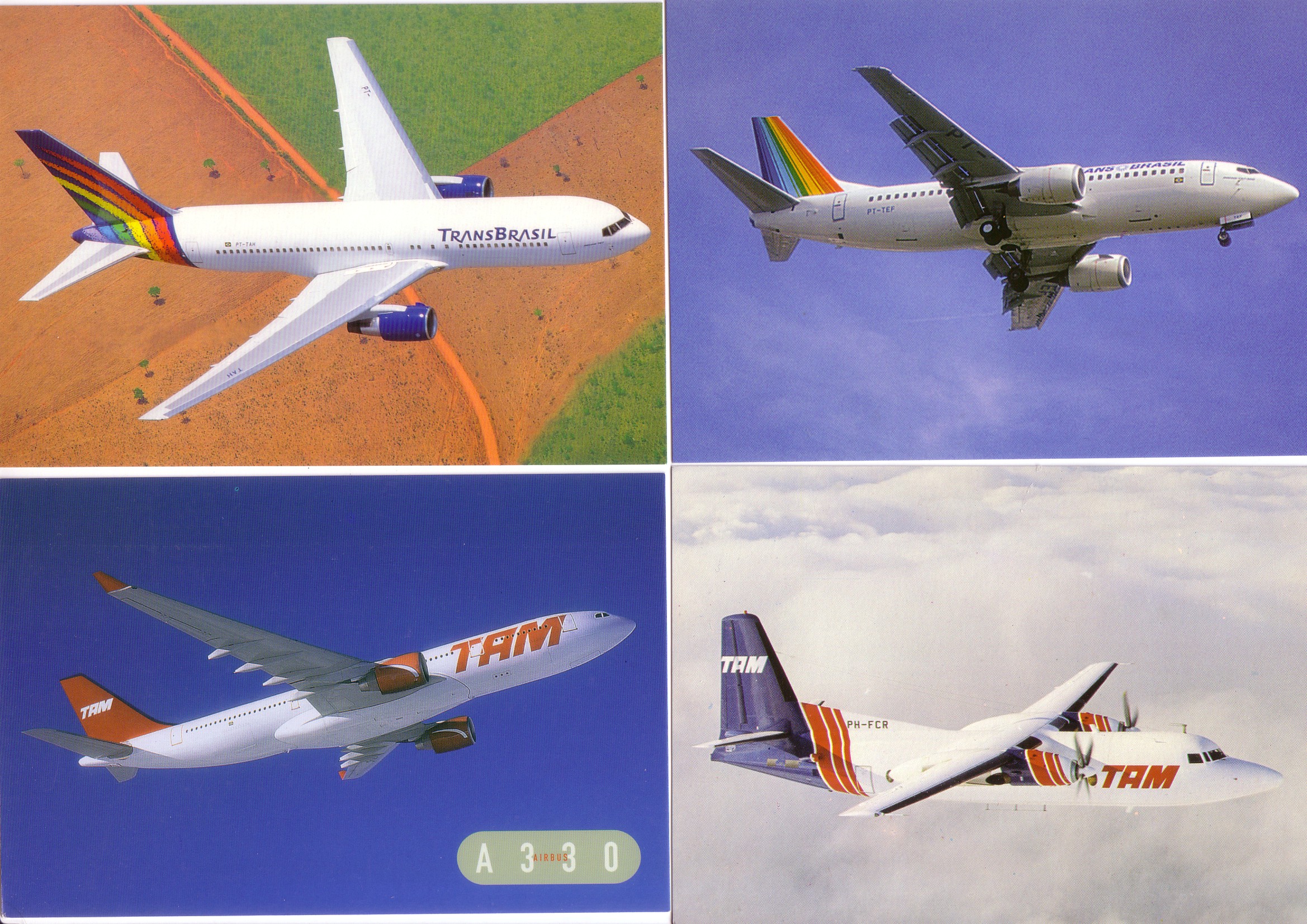 ![]() Transbrasil went on to be Boeing operators of 727,737 and 767 before collapsing in 2001. This time VARIG itself was in no state to pick up the pieces. It was facing competition on its international and domestic services from TAM – a 1976 start-up initially with Fokker F27, F100 and later Airbus A320 and A330. Later Transbrasil and TAM cards follow. The Transbrasil 767 shown from above recalls many earlier Movifoto cards.