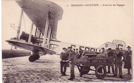 ![]() The next card by another Le Bourget publisher CLD No.7 shows latest technology baggage handling and may be the only card ever to feature “L arrive’ des bagages” as its central theme. The Handley Page Transport Ltd named cart implies that each company provided its own equipment. The bags have arrived on W8 Prince George G-EBBH.