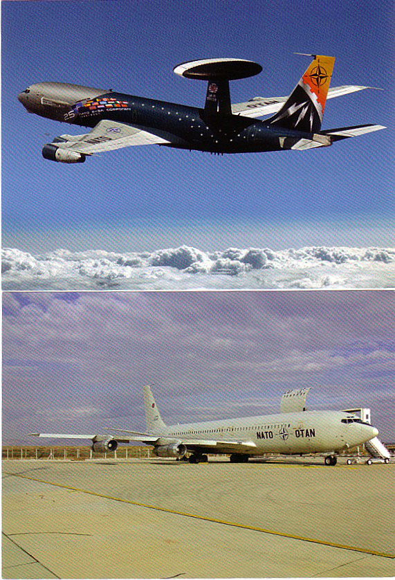 ![]() The 707 piece by Bill Demarest in December happened to coincide with the 50th anniversary of the 1st flight of the true airline 707 - as distinct from the prototype and its KC-135 derivatives. Also celebrating an anniversary – 25 years was the NATO 707 derived E-3 AWACS squadron at Geilenkirchen, Germany. For the anniversary they produced a set of cards featuring not only the E-3 in a special colour scheme, but also a support and training 707 freighter. Like all the AWACS squadron they both carry Luxemburg-ish markings, the E-3 being LX-N90459 and the 707 LX-N20000. The 707 has always been in military hands, having been previously with the Luftwaffe.