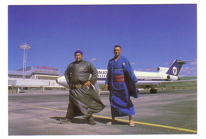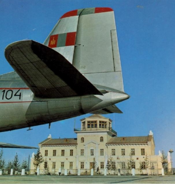 We have previously featured a Soviet airport of neo-classical design at Lvov. On the face of it, this card is more of the same. It is actually a vertical card but the bottom is blank space so I have edited it to save space. The fact that it is old enough to feature an IL-14 is interesting enough but the odd thing is that the tail flag is not the all-red Soviet emblem but has a vertical blue/grey stripe. Now the then constituent republics of the USSR all had their own flags but these were not used by the regional divisions of Aeroflot. The clue is the airport location, Ulan Bator in Mongolia. Although to all intents and purposes a Soviet republic, the Peoples Republic of Mongolia was nominally independent. Founded in 1924 it was the destination for the 1926 first international service of the Soviet airline Dobrolet (later Aeroflot). MIAT (Mongolyn Irgeny Agaaryn Teever) was founded in 1956 with a mix of IL-14 and An-2 aircraft and opened international service to Irkutsk and Beijing using the IL-14 s as shown.