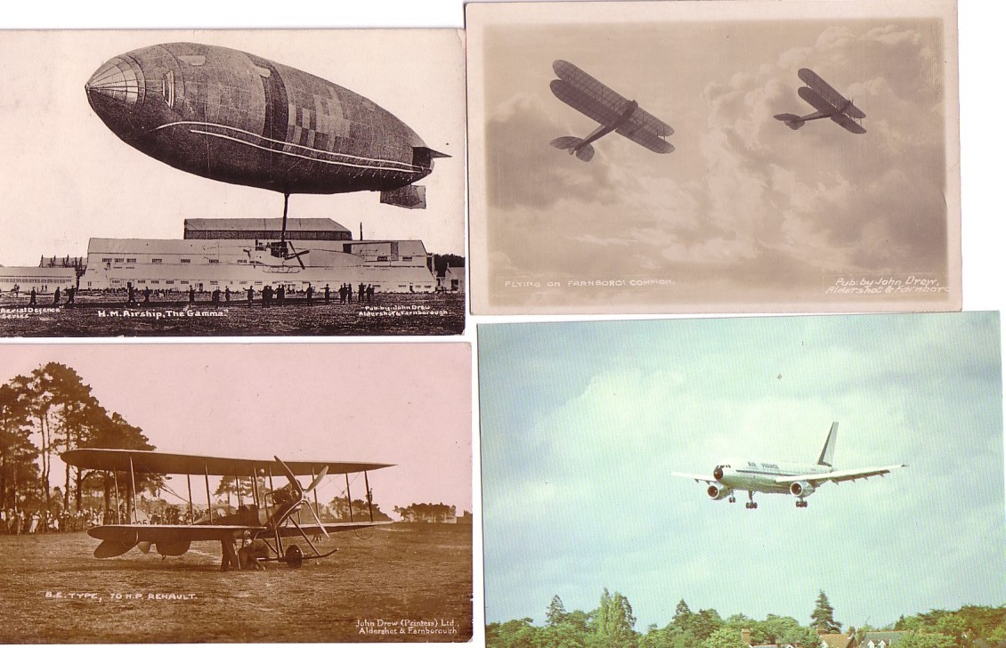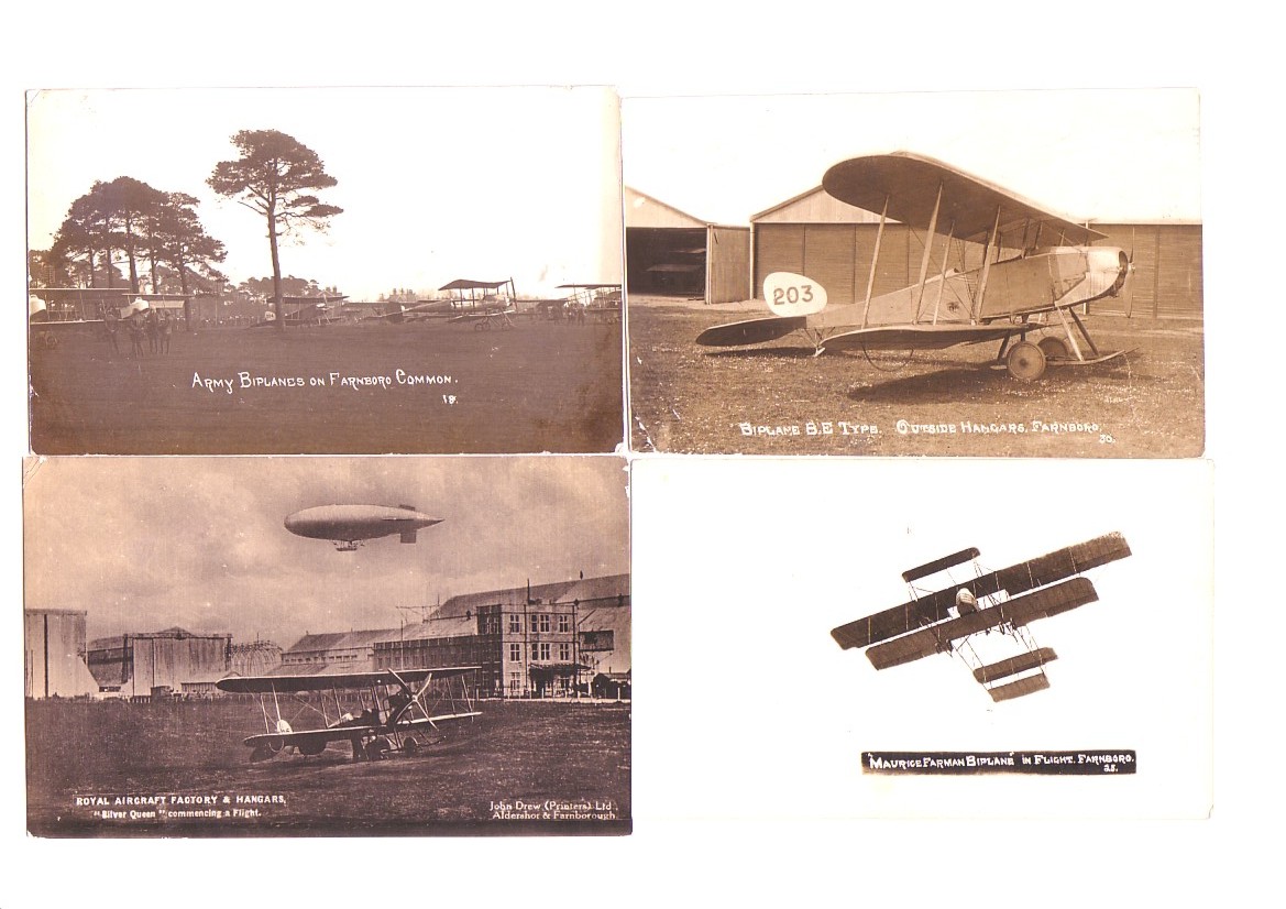 These four consist of 3 by Scovell of Aldershot “Army Biplanes”, BE Type outside Hangers Farnboro & “Maurice Farman Biplane in Flight Farnboro”. Also the “Royal Aircraft Factory & Hangars” by John Drew.