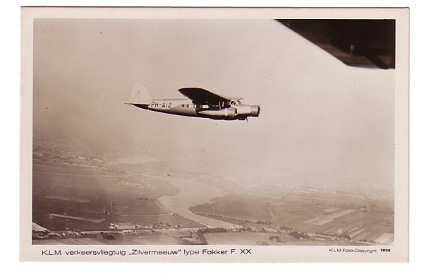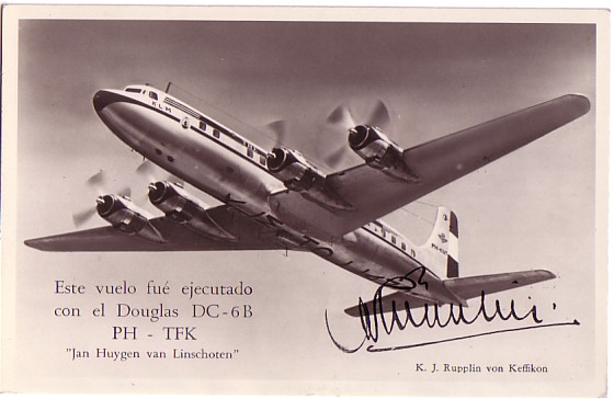 In the early twenties both KLM and Imperial Airways in the UK sought to publicise their pilots by the same method, postcards with a pre-printed autograph. I get the impression that the KLM series was more extensive and the cards were black and white, not sepia like the Imperials. Shown is G Geysendorfer posed with a Fokker F.VII, one of which the piloted on a privately chartered first KLM flight to the East Indies (Indonesia) in 1927.