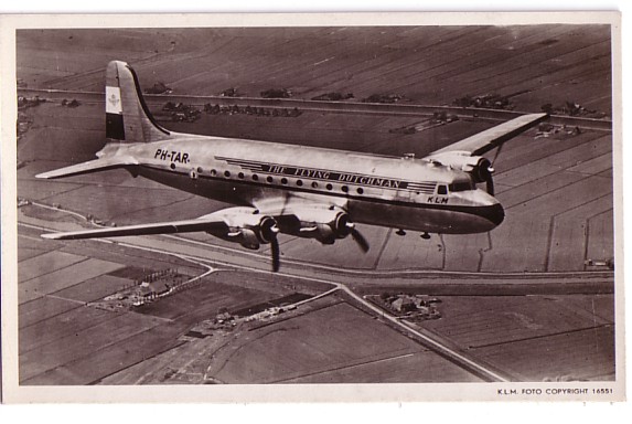 From 1945 to the late 50s KLM Royal Dutch Airlines aircraft carried the text “De Vliegende Hollander” on one side and “The Flying Dutchman” on the other. This card of a DC-4 PH-TAR shows the scheme. This card was also produced with ID revised to PH-K.L.M in a 30th anniversary set in 1949 and PJ-KLM with Spanish text for KLM in the West Indies.
