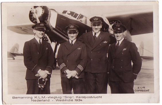 Another Fokker F.XVIII “Snip” made the first KLM flight to the Dutch West Indies in December 1934. Again KLM issued a card showing Captain Jan Hongdong, co-pilot/navigator Van Balkom, radio operator Van der Molen and engineer Stolk