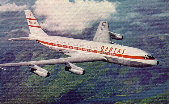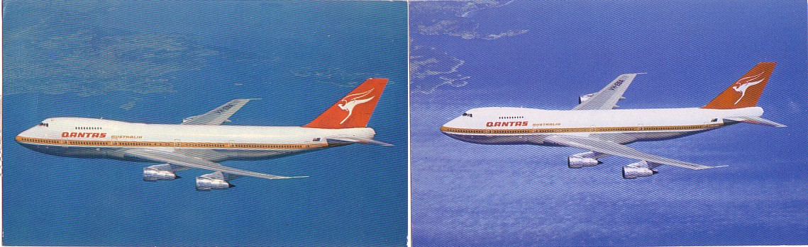 When the 747 Jumbo jet was introduced Qantas was one of its first customers and again issued a number of cards which were given away on board and hence can still be easily found, although like one earlier 707 (VH-EBU air flying right) card which had no less than three background variations, the “standard” air to air shot of VH-EBA had variations in both flight attitude and cloudscape.