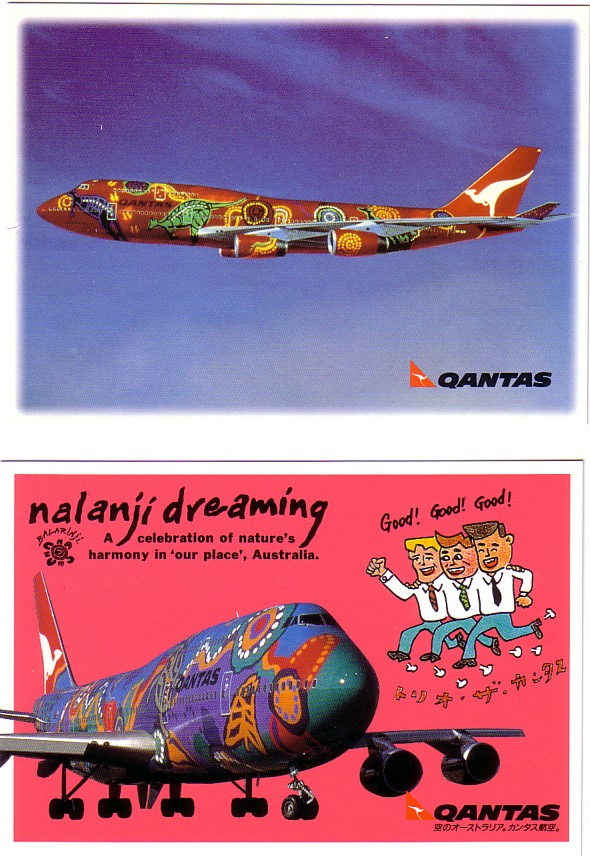 The Kangaroo tail colours have remained with Qantas to the present day through the later -300 and – 400 747 series. The fuselage is now in fashionable all white. In addition to company cards, many publishers including Australian Australex have produced cards of the fleet. The other trend, of which Qantas was an early adaptor, was the special colour scheme. Qantas painted two 747s, a 747-400 and a 747-300 in aboriginal art inspired schemes, the red “Wunala Dreaming” and the Blue “Nalanji Dreaming”. Both have featured on large size cards with “Wunala also on this card from the Frankfurt office for its first arrival on 6 Sept 1994.“Nalanji” featured on a strange set of 5 cartoon cards aimed at the Japanese market.