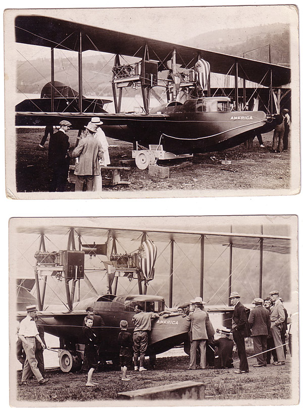 ![]() Both of these real photo postcards show the Curtiss America flying boat, built at Hammondsport , NY for a proposed transatlantic flight in 1914. The occasion is the naming ceremony on June 22 and these 2 cards feature Curtiss himself – far left top card, and Irishman Cyril John Porte who was also involved in the design. ( right with hat, lower card). The design was underpowered and before improvements could be made, the outbreak of war later in 1914 caused Porte to return to service in the Royal Navy where he had previously been a submariner as well as an aviator in the RNAS. Rejoining the RNAS he was instrumental in buying the America for the RNAS in 1916 and in the development of the Curtiss based Felixstowe boats before dying from a revival of his recurrent TB in 1919.