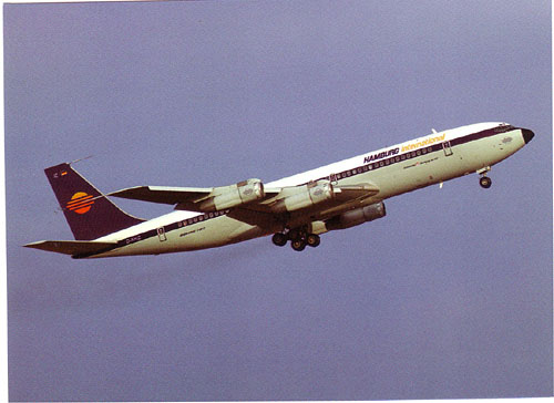 On the back it just has , in German, Boeing 707-320 , first flight July 1959 . I have not seen the full set – maybe there are also retro-edited Hamburg International DC-3s and even JU/52 s ?
