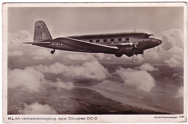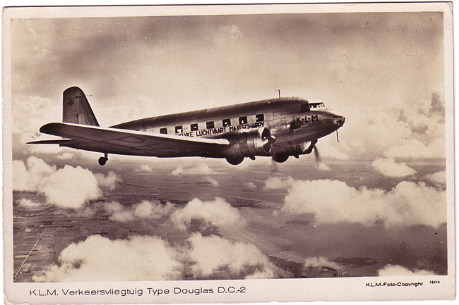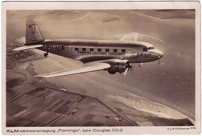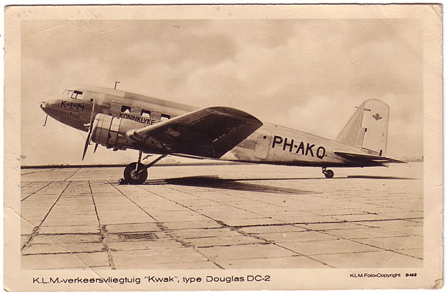 ![]() Written “Not far from Copenhagen Altitude 3500 metres This has been a very interesting jouney tho not very thrilling. The plane travels far more smoothly than a train or car. I cd see a bit of the ground in England but there has been a lot of cloud since and we travel above it – rather like exploring the Antarctic….. . A backstamp “KLM restaurant-Vliegtuig” suggests he got fed too. One more DC-2. PH-AKQ Kwak , written but not mailed or dated.