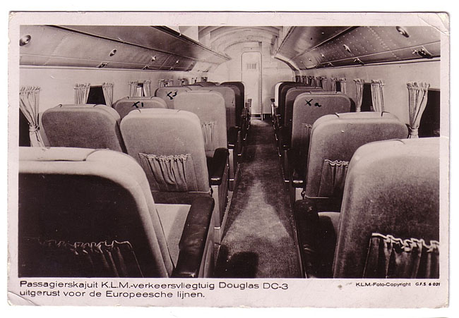 ![]() This is an interior of a DC-3 in European configuration – more seats and less leg room than the East Indies version. The card is a victim of the “I sat here” syndrome but this time three seats are marked with a cross. The key is on the back, 1 Daddy 2 Me 3 Mayor . The card is mailed from Berlin August 1937 with three swastika air mail stamps. The addressee is a Mrs Emrys Evans of Wallasey on the Wirral and is written by “Michael” presumed to be her son. It reads “6000ft up Arrived Amsterdam 1.15. had lunch and stayed Carlton Hotel . Saw Jamboree from the air .Flying to Berlin now. Returning Amster tonight. Coming home tomorrow. Time (German) 10.15”. So, it seems we have the Mayor of Wallasey off on a municipal jolly to Amsterdam and Berlin at the ratepayers expense flying on the KLM service Liverpool-Amsterdam, with a night there, then on to Berlin for a day trip then another night in Amsterdam. The wonders of Google research reveals that Emrys Evans was the town clerk who somehow wangled his son on the trip as well. Local press files may or may not disclose more . One possibility is that Berlin City was celebrating its 700th anniversary in 1937 with typical Hitler –era celebrations. Is it possible that invitations to were sent to many European cities to send representatives including a child , with the latter representatives being featured alongside Hitler Youth. ? Finally , near to the end of the pre-war era, a card mailed 24 July 1939 from Amsterdam by LWH who was staying in the Hotel Rynders “Arrived safely at 11 a.m . The long wait at St Pancras was very tedious but the flight was allright. Weather showery still.” Given that the addressee was in Nottingham perhaps he would have been better going via Doncaster.